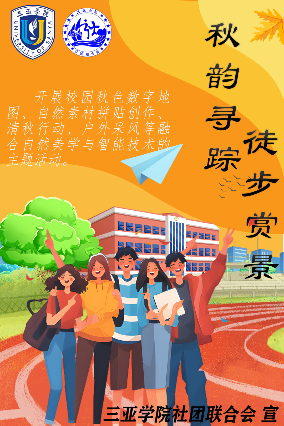 指尖轻点藏尽清秋景致,巧思拼贴凝结草木情致,户外寻芳、躬身实践中,让秋意与热爱撞个满怀。各社团可联合开展“校园秋色数字地图”、“自然素材拼贴创作”、“清秋行动”、“户外采风”等活动,以科技记录秋意,用艺术表达自然。