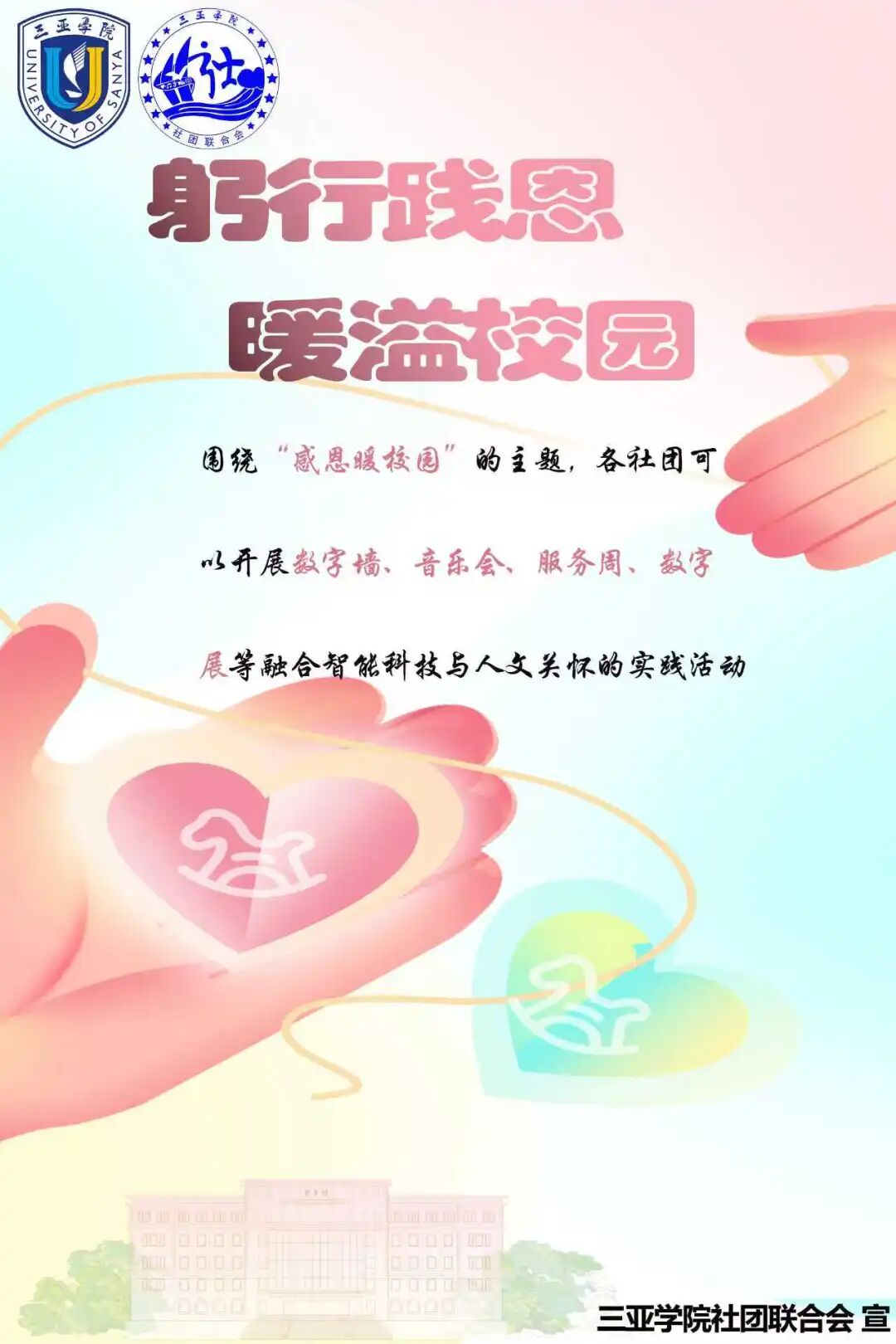智能技术与人文关怀携手同行,让感恩文化如秋光般浸润校园,自然流淌成诗。各社团可联合开展“‘校园感恩数字墙’互动平台”、“秋日感恩音乐会”、“校园暖心服务周”、“感恩文化数字展”等融合智能技术与人文关怀系列的跨界实践活动。