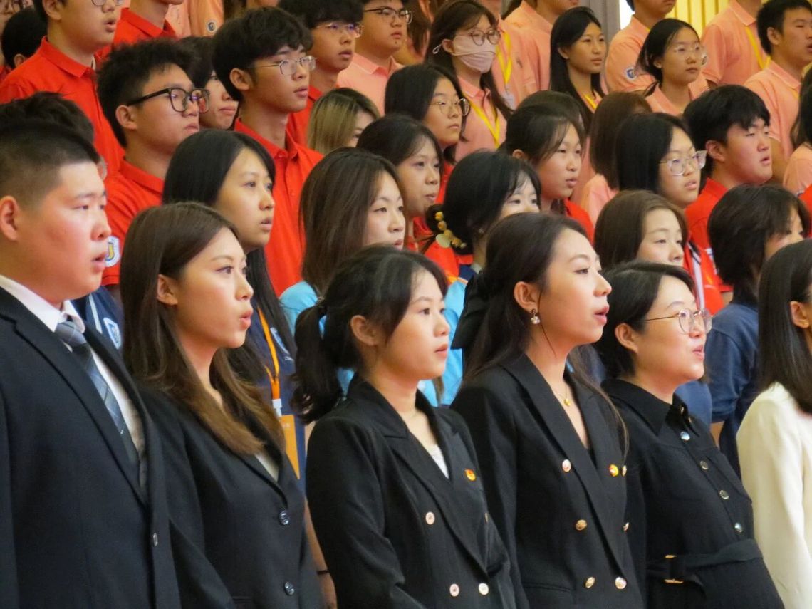 《光荣啊,中国共青团》坚定的声音在空中回荡,在铿锵有力的旋律中,全体人员肃立,嘹亮的歌声回荡在每个人的耳边,歌声中充满了自豪。