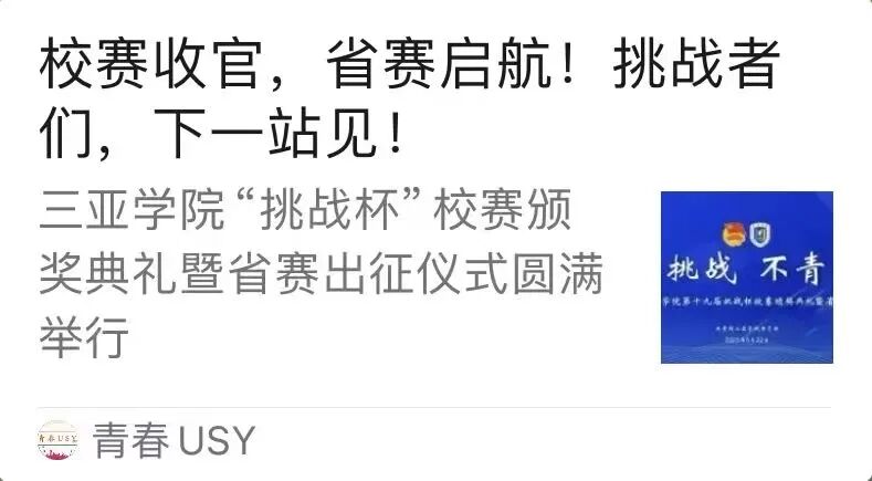 三亚学院将持续以科创赛事为牵引,培养学生科技创新能力、激发创新热情。校团委将在“挑战杯”激励制度、培育机制、氛围营造等方面精准施策,出台系列举措,引导青年争当科创排头兵,力争将“挑战杯”打造成彰显三亚学院人才培养特色与质量的亮丽名片!