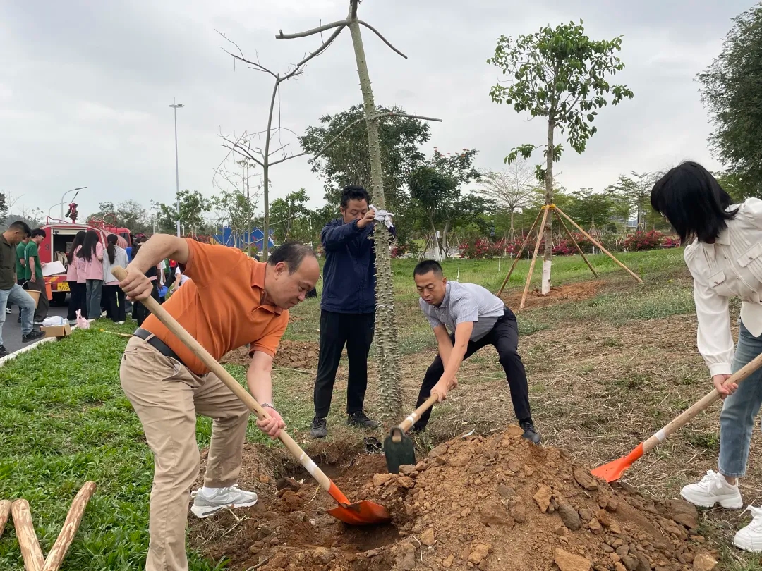 三亚学院党委书记陈焕东,党委副书记、副校长、学务长高一兰,校长助理李志伟及各学院师生代表百余人一同到场参加植树活动。各位师生一同挥锹培土,共话绿色发展。