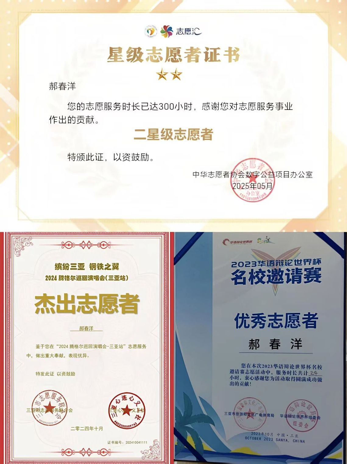 2024年任三亚简爱义工社副秘书长,2025年晋升副社长兼执行秘书长,组织格斗赛、敬老爱老、防风救灾、帮扶困境儿童等公益项目,助力社团获最佳公益奖。