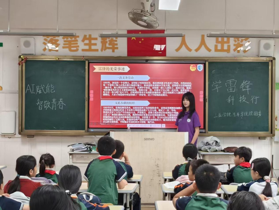 新能源与智能网联汽车学院走进小学开展“AI赋能·科技行”志愿宣讲,结合专业特色普及雷锋精神与新能源汽车安全知识,以大手拉小手传递安全理念。