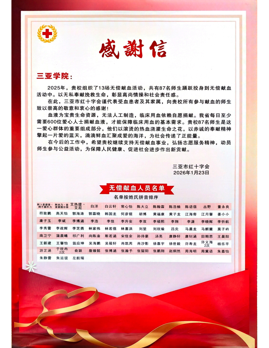 值得一提的是,近日,三亚市红十字会向我校发来感谢信,对2025年我校组织 13场无偿献血活动、87名师生踊跃献血的善举致以崇高敬意,这份认可正是我校师生践行雷锋精神的生动注脚。