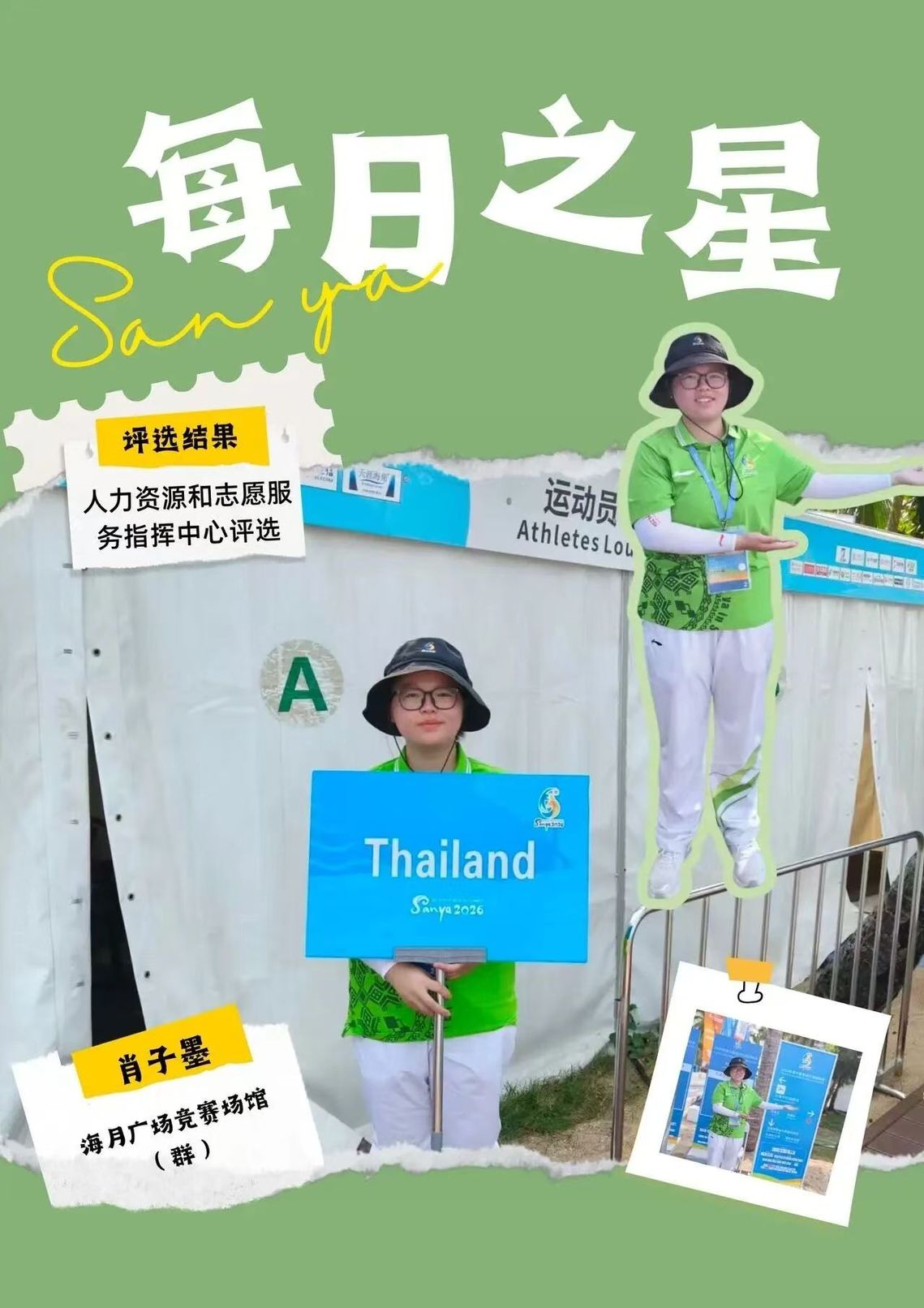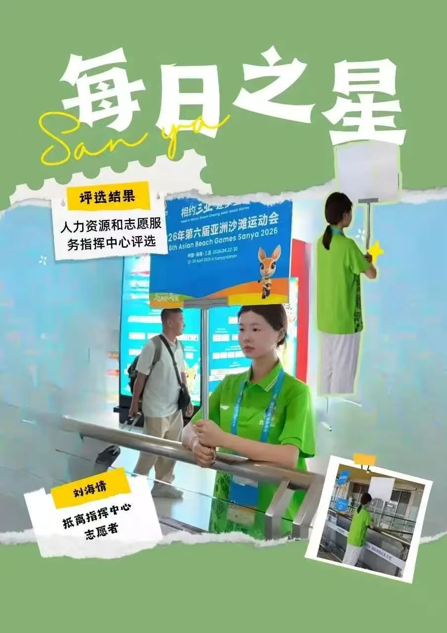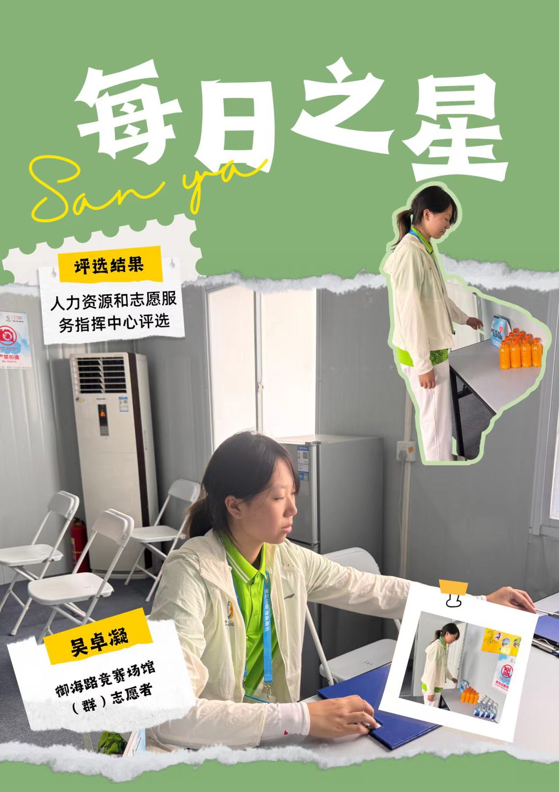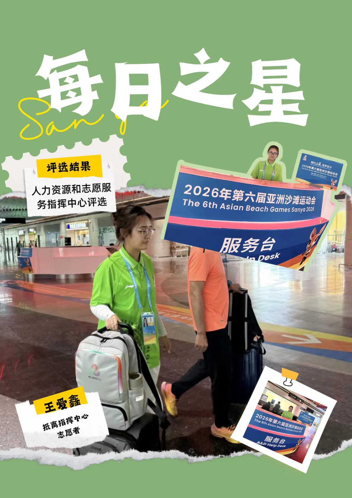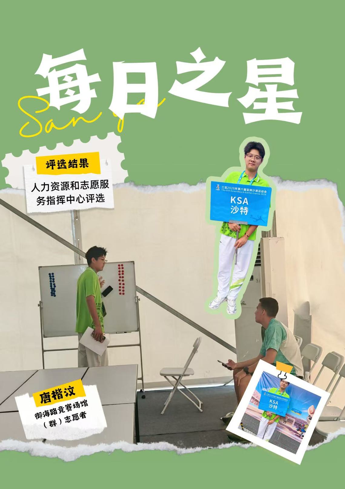 这份荣誉是对我单日工作的肯定,更是对全体志愿者的见证。吃苦耐劳是底色,精益求精是追求,未来我将继续以饱满热情坚守岗位,用细致周到的服务展现中国青年昂扬风貌,与所有志愿者一同,让青春微光汇聚成照亮亚沙的璀璨星河,助力盛会圆满落幕。