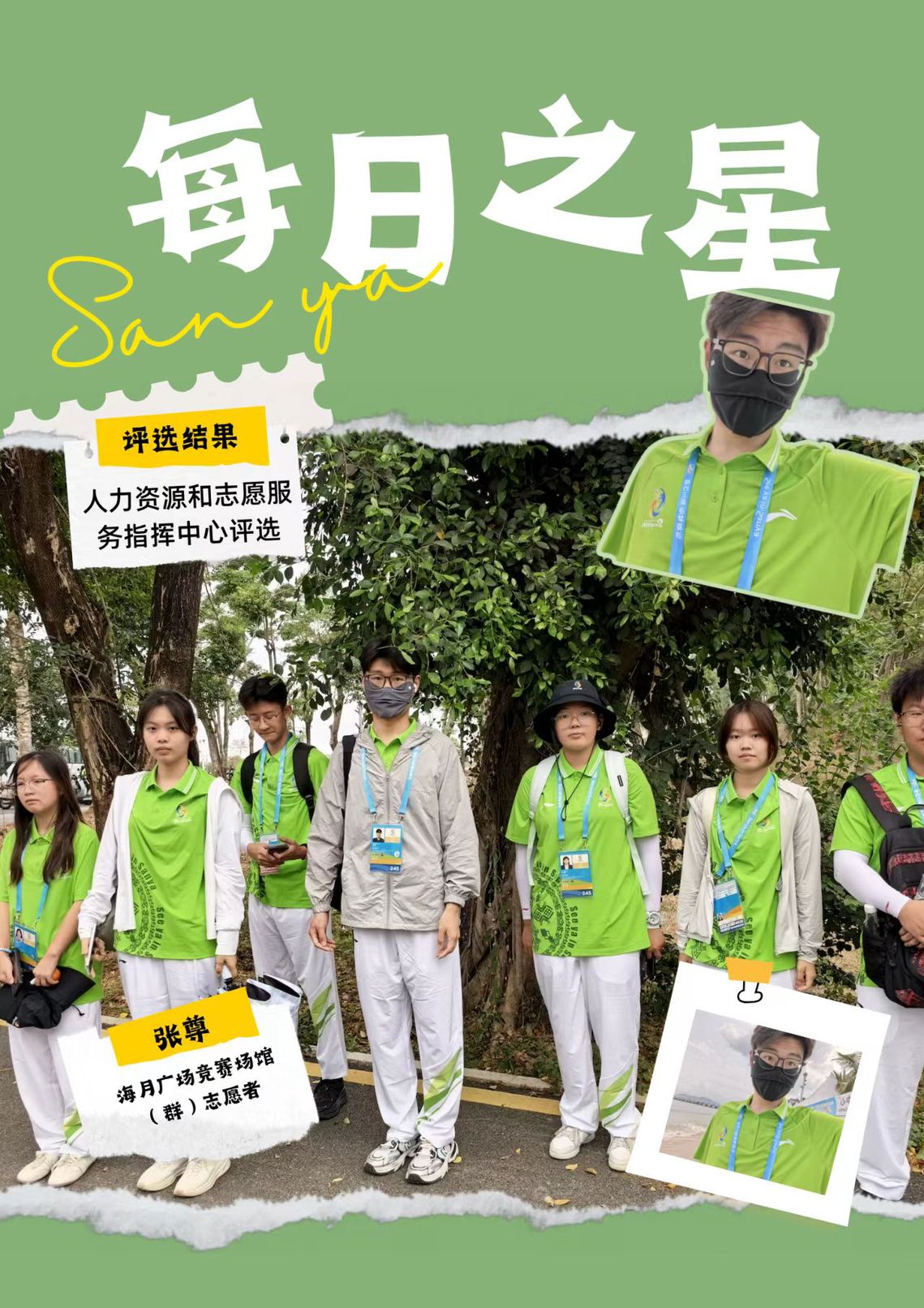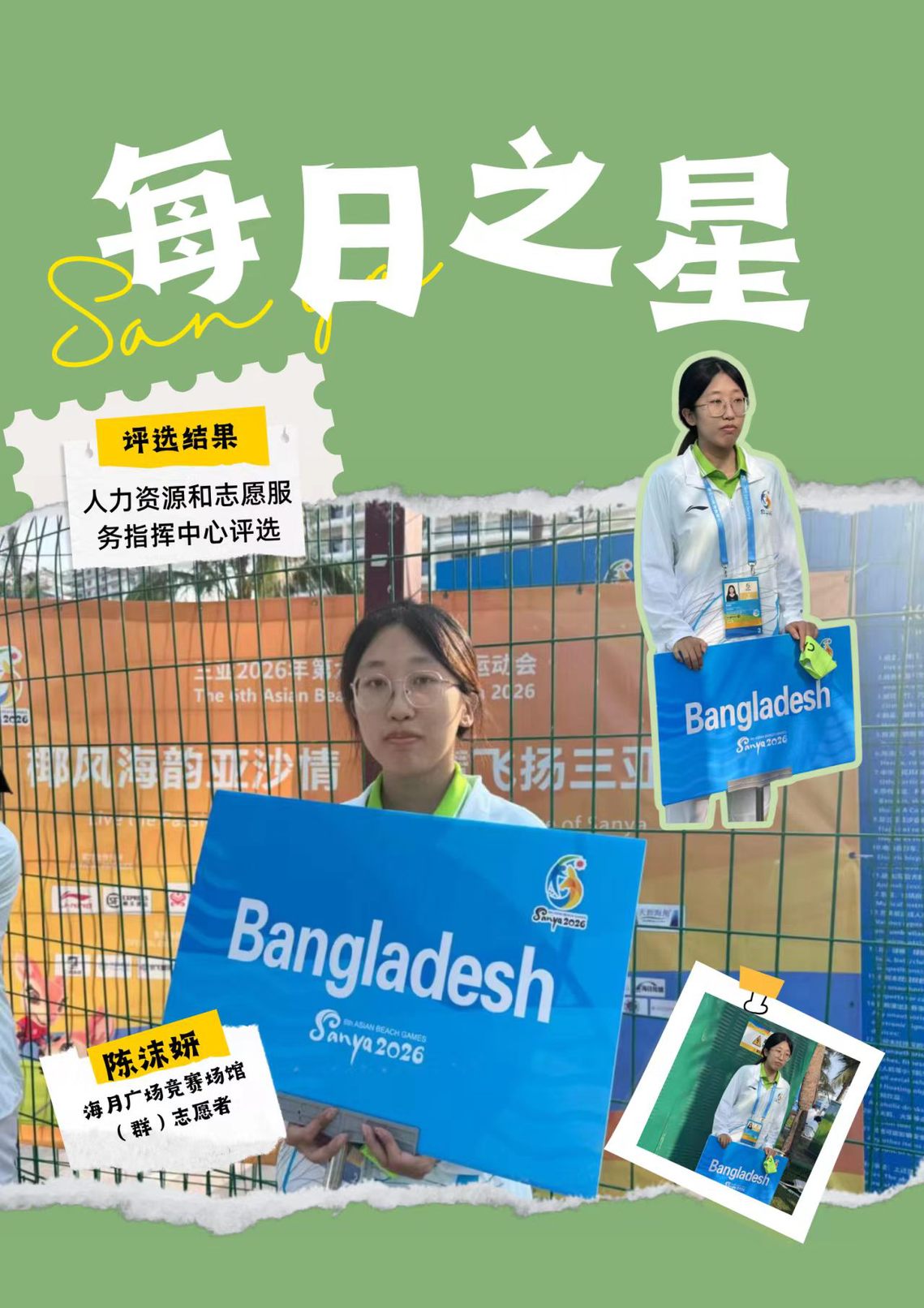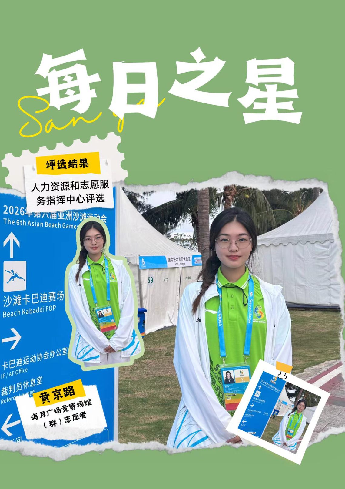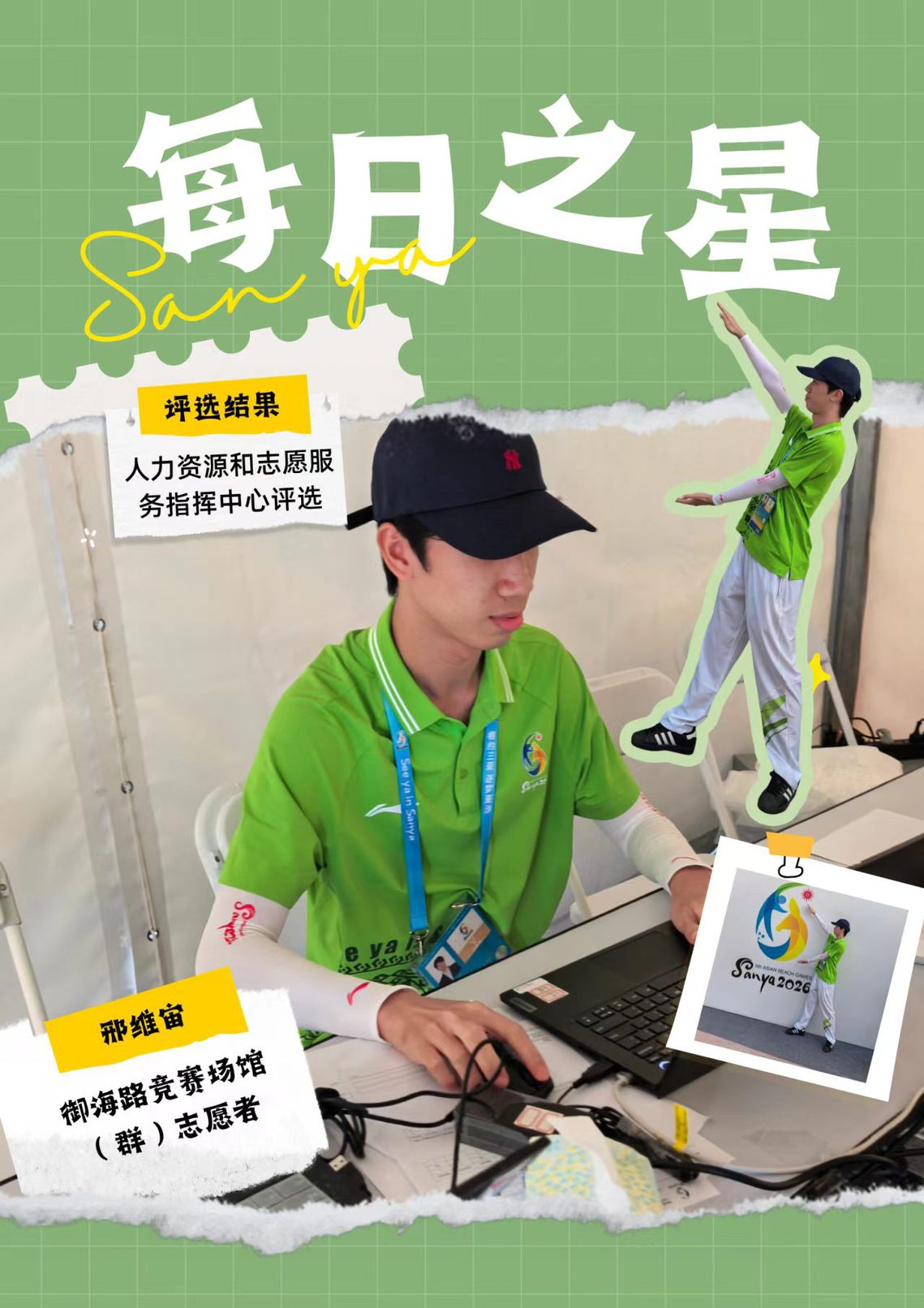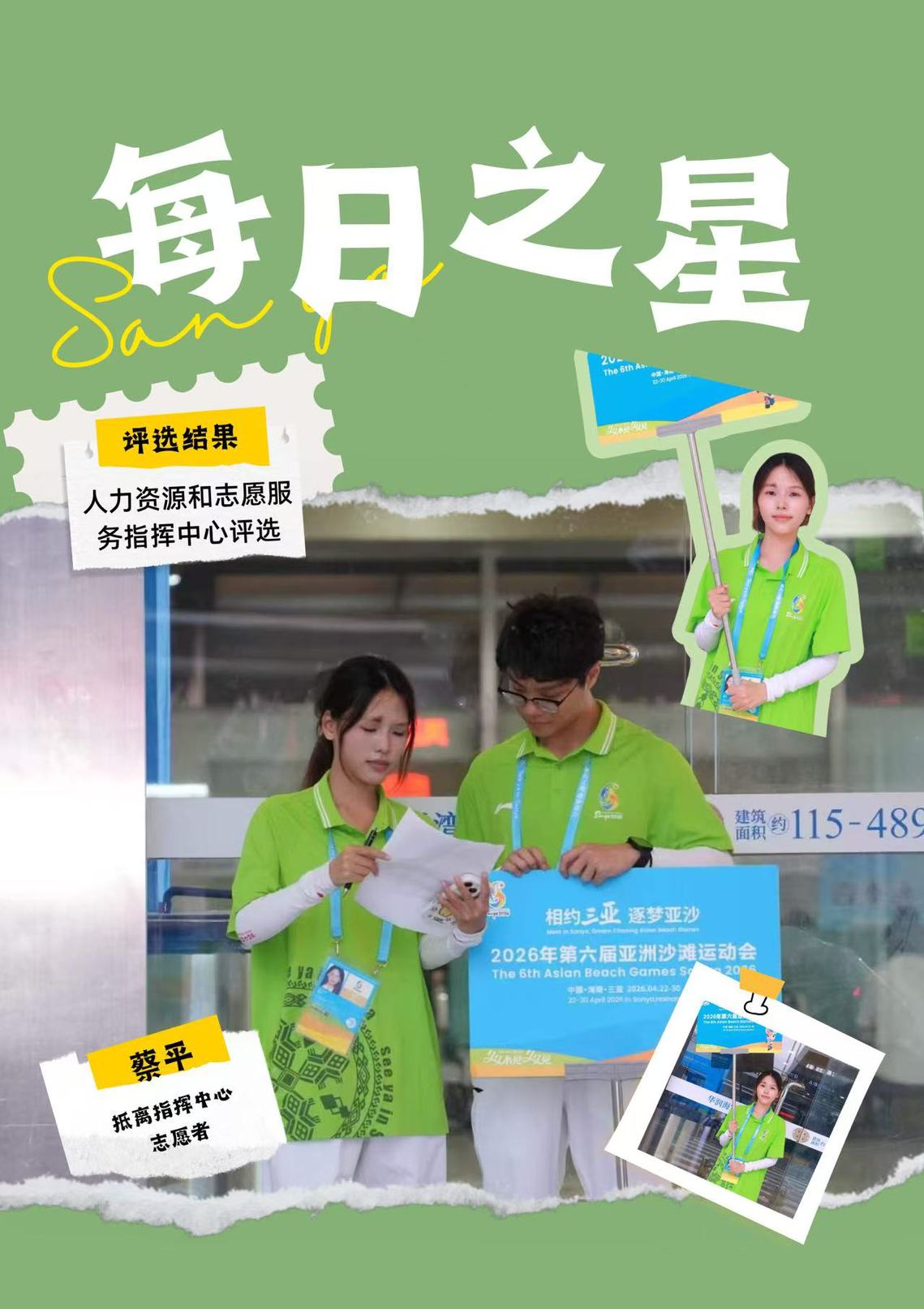 这份荣誉是对我单日工作的肯定,更是对全体志愿者的见证。吃苦耐劳是底色,精益求精是追求,未来我将继续以饱满热情坚守岗位,用细致周到的服务展现中国青年昂扬风貌,与所有志愿者一同,让青春微光汇聚成照亮亚沙的璀璨星河,助力盛会圆满落幕。