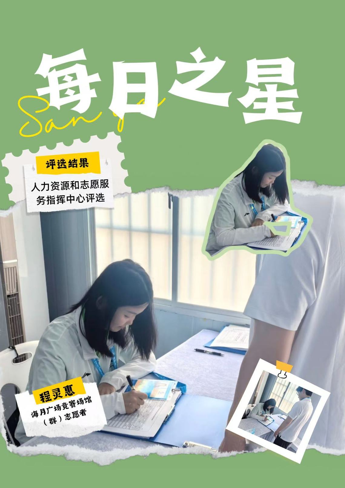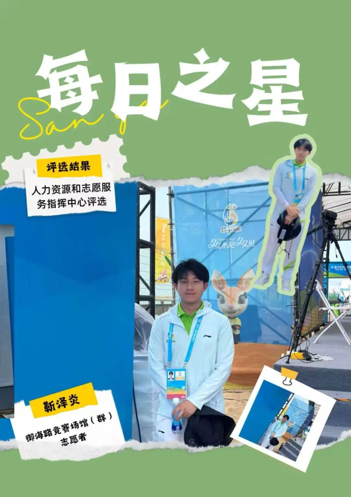 作为运动队服务志愿者,我荣幸获评“每日之星”。我始终以饱满热情全程陪伴运动员,从赛前路线引导、赛程提醒,到赛中需求对接,时刻保持专注,耐心解答疑问,精准对接赛事安排。用真诚沟通拉近距离,用细致服务消除后顾之忧,让运动员全心投入比赛。
