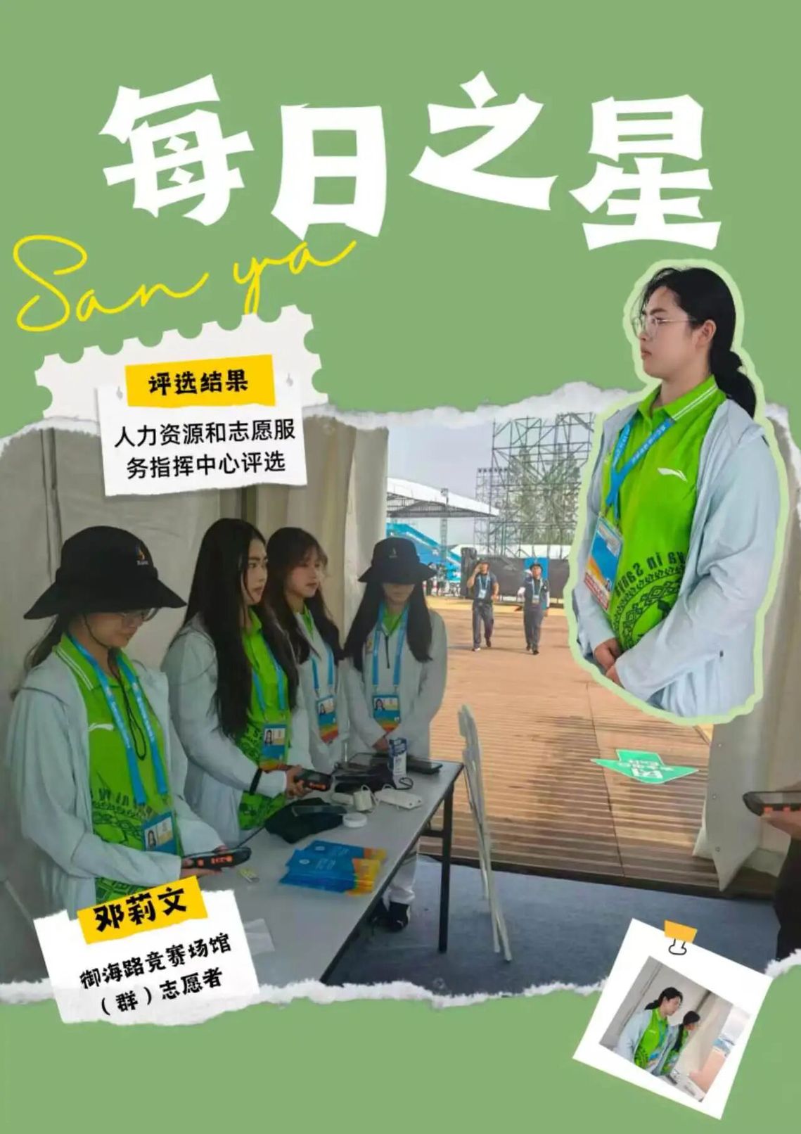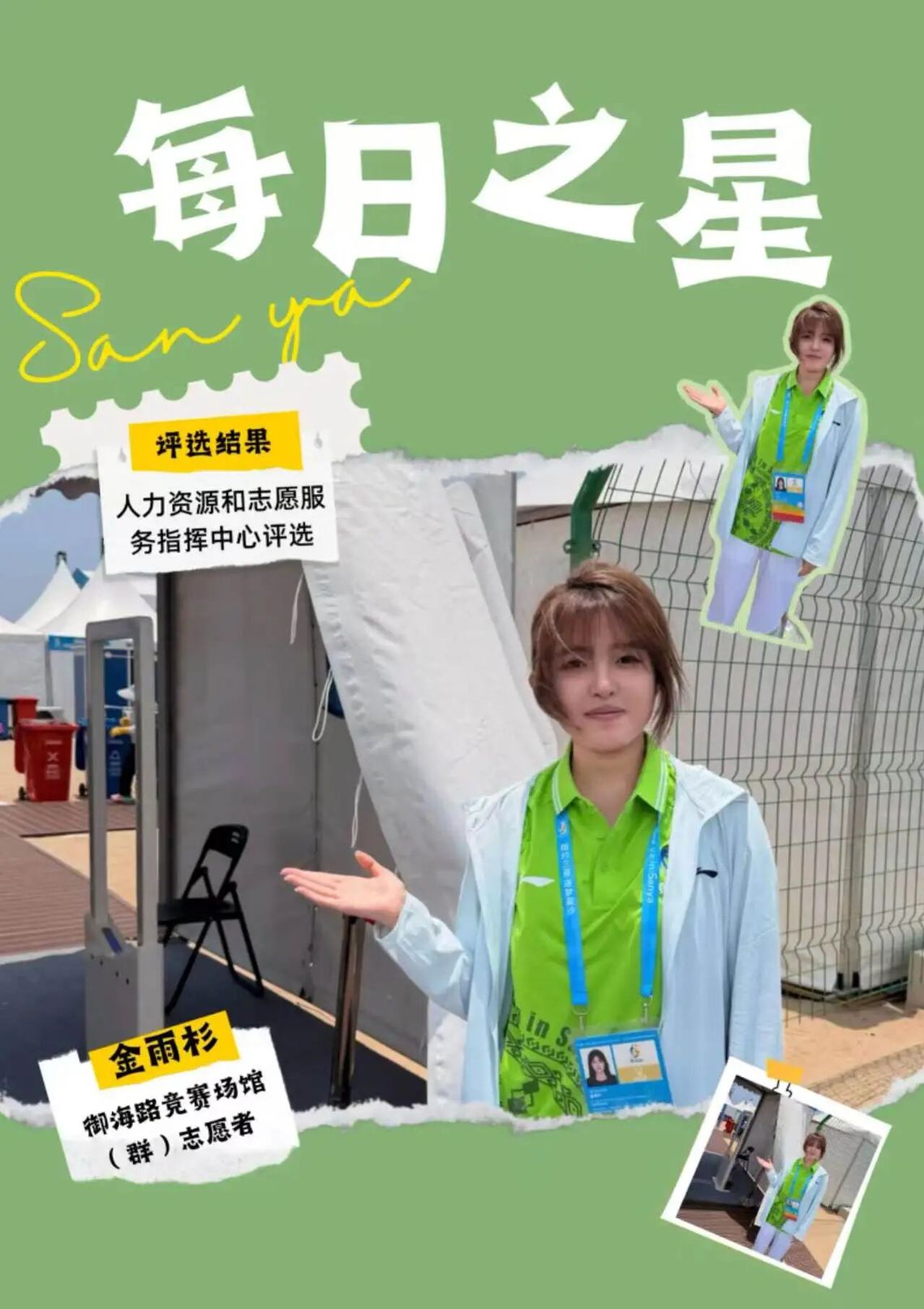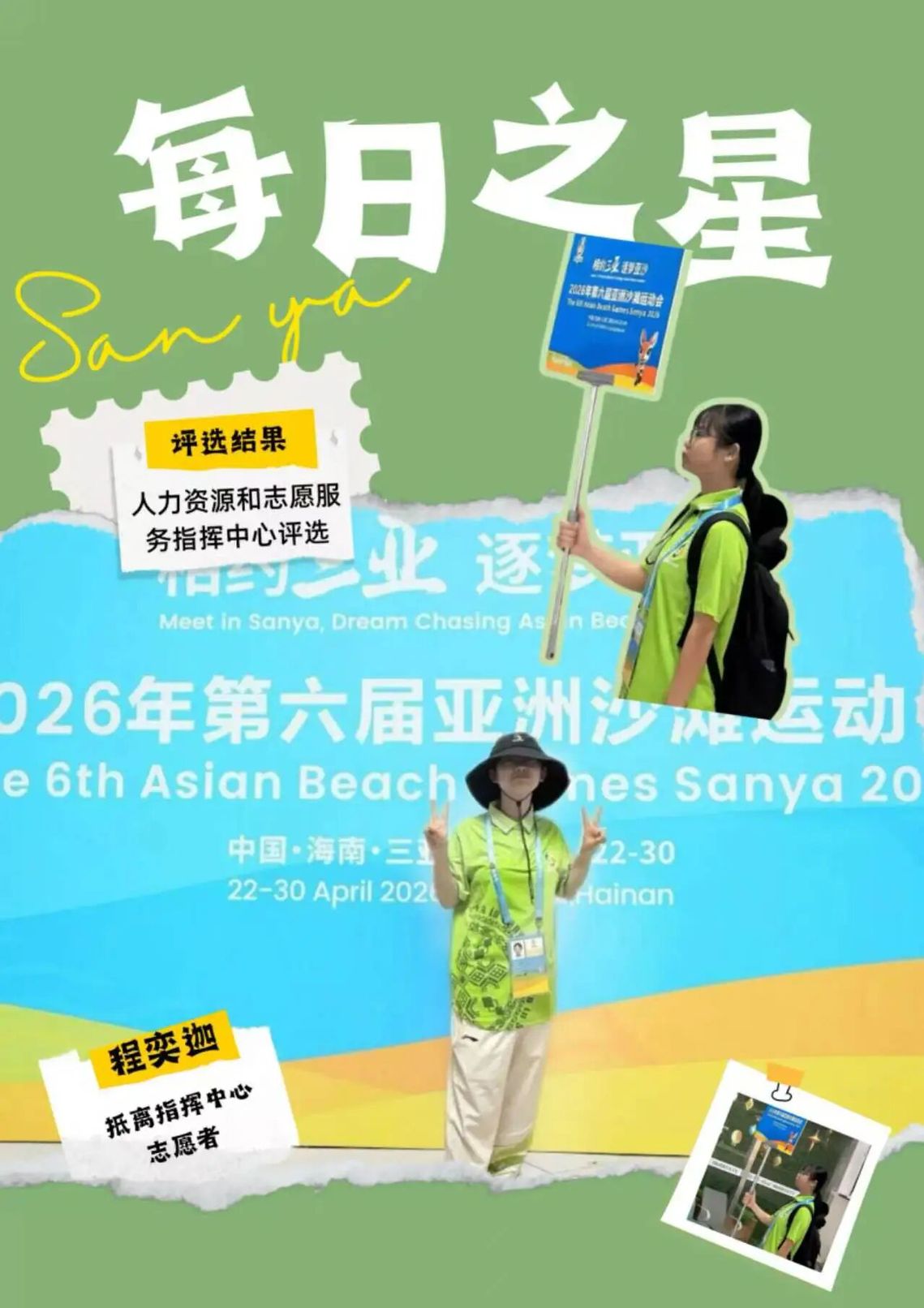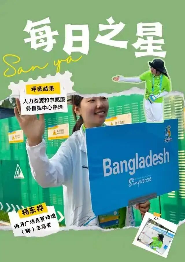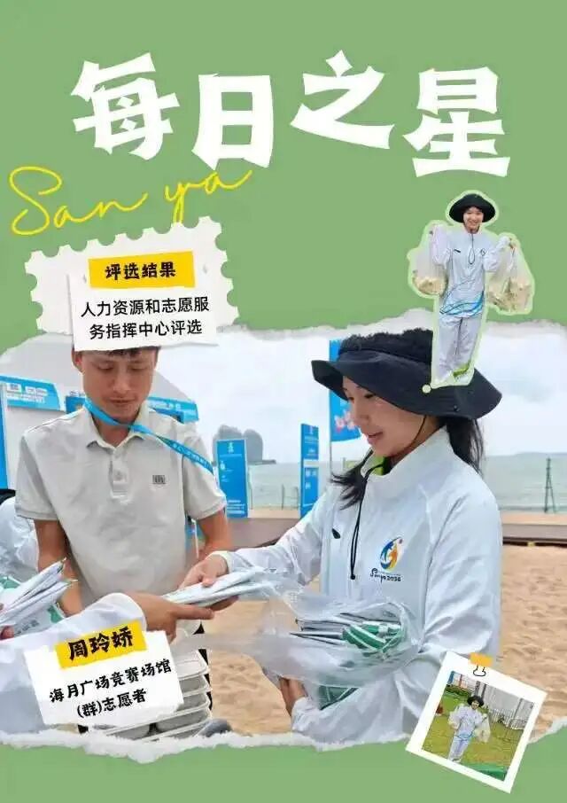 这份“每日之星”的荣誉是鼓励更是鞭策。未来我将继续以饱满热情投入抵离服务,精益求精,用真诚与专业传递亚沙温度,展现中国青年志愿者的风采,为亚沙会圆满举办贡献青春力量。