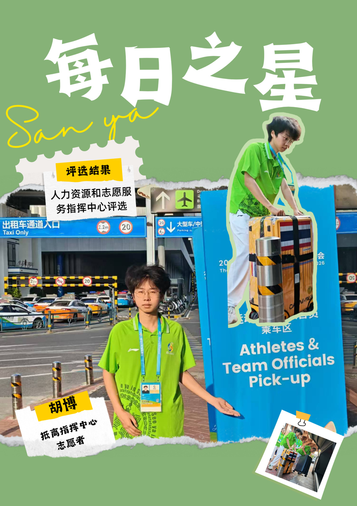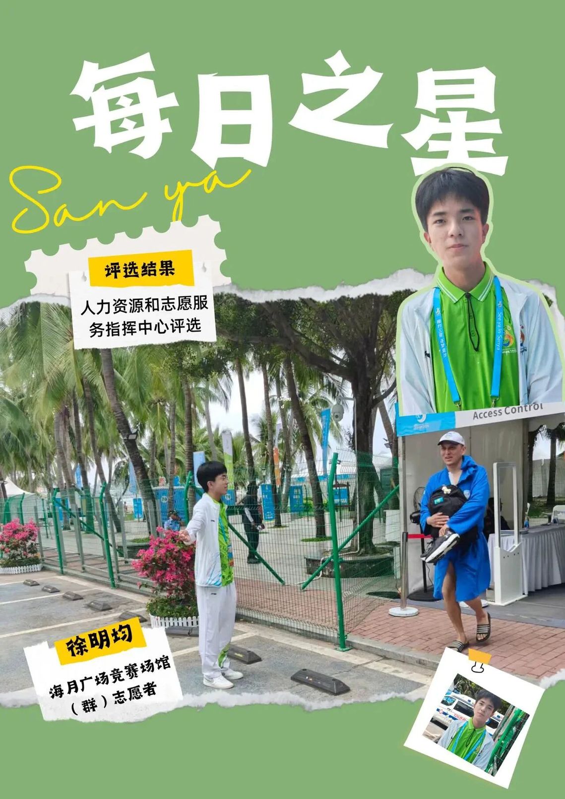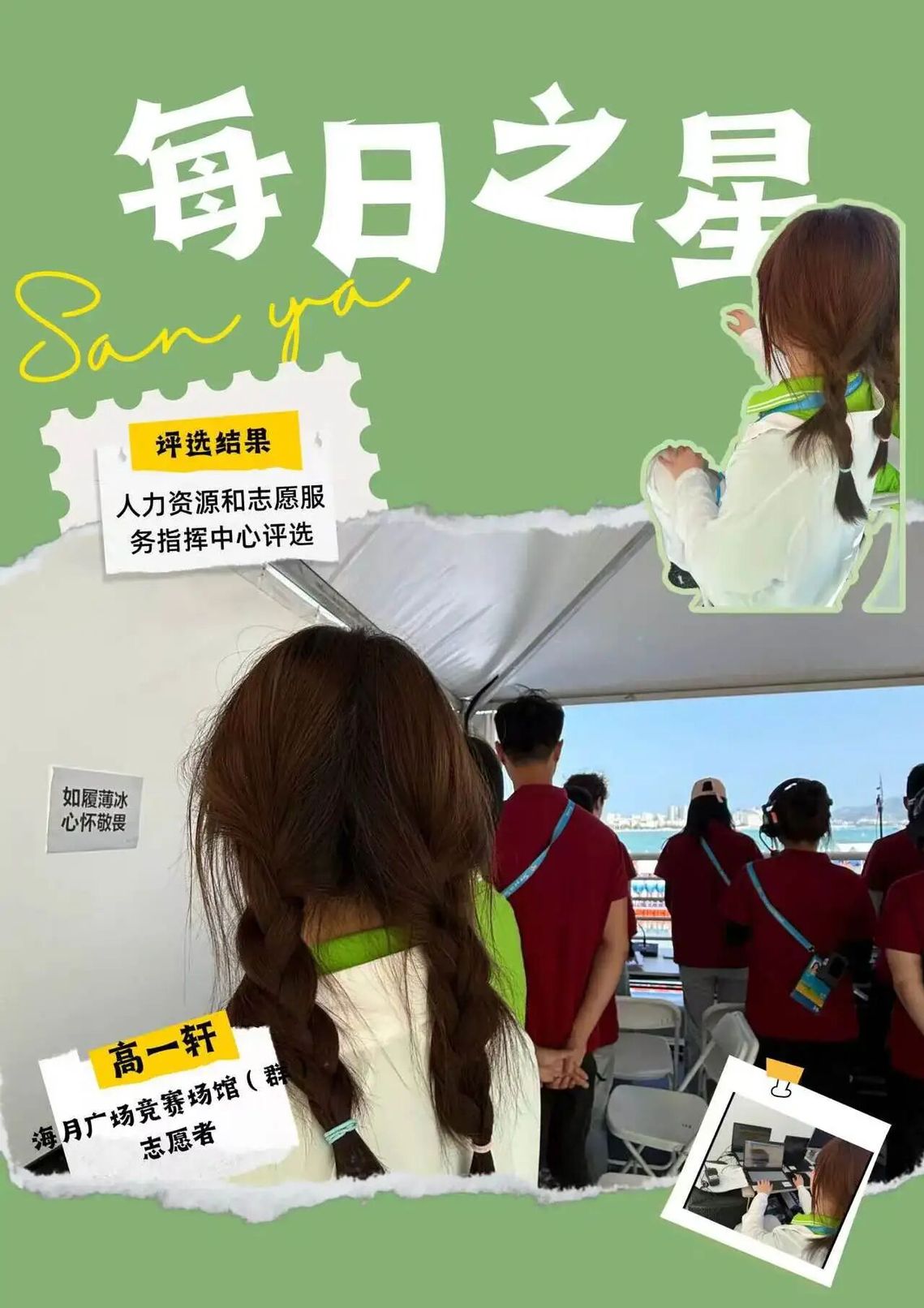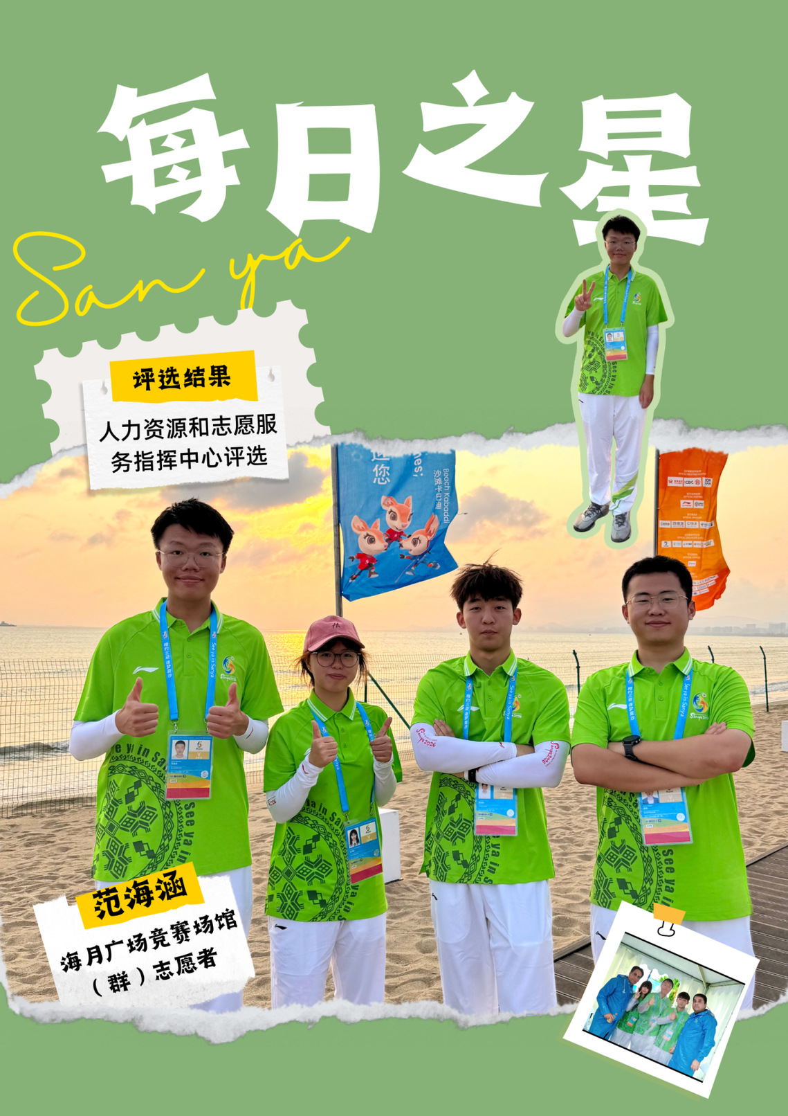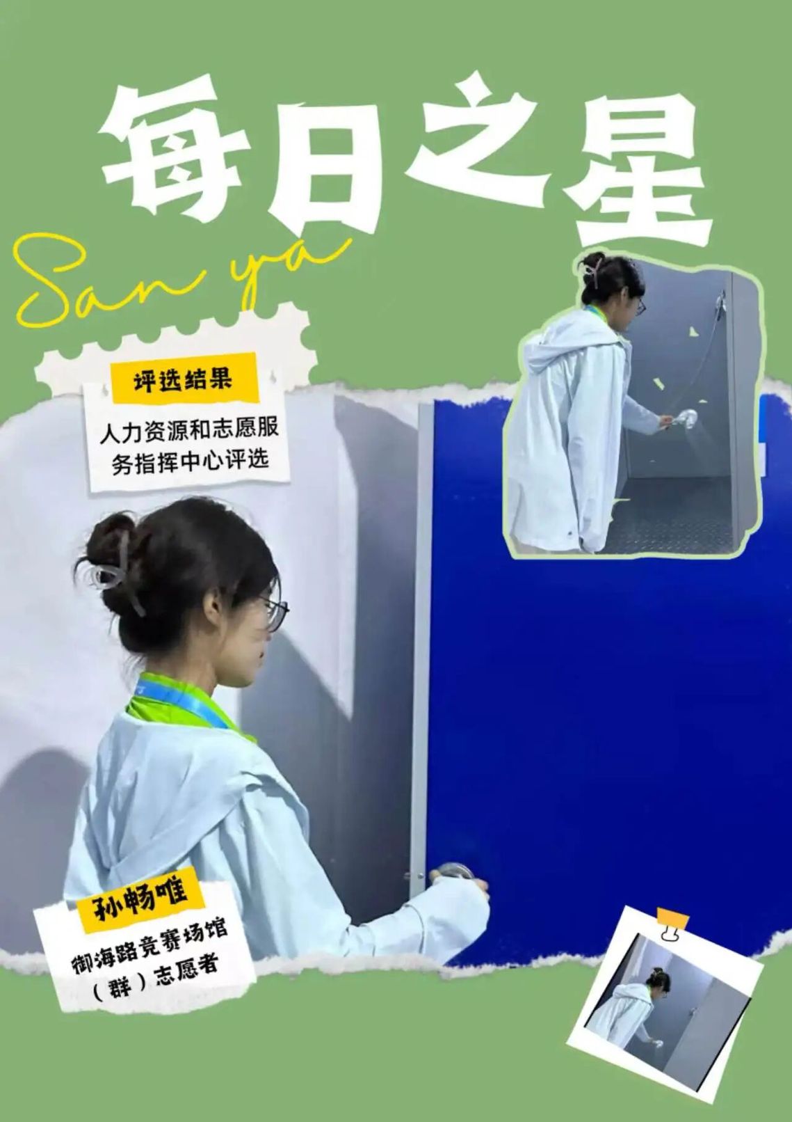 这份“每日之星”的荣誉是鼓励更是鞭策。未来我将继续以饱满热情投入抵离服务,精益求精,用真诚与专业传递亚沙温度,展现中国青年志愿者的风采,为亚沙会圆满举办贡献青春力量。